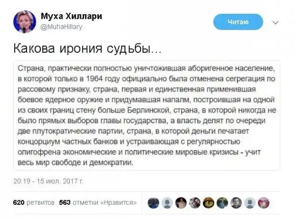 Да хорошо, правильно написано, в общем. Только к такой плохой США в очередь стоят страны вроде Украины, чтобы самим на колени встать да ублажать. Россия вроде кочевряжится, Ельцин помнится тот только был в подружках у американских президентов. Но нам бы, товарищи, чтобы жить хорошо начать нужно пахать, работать, думать, получать образование. А такими патриотическими картинками далеко не уедешь. Время такое, сначала пахать 30 лет, потом может будет лет 10, чтобы отдохнуть, пока болезни в могилу не сведут.