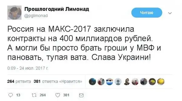 Эй, пацриоты МАКС 2017. Почти вся сумма контрактов состояла из покупок самолетов у самих себя (Суперджет и МС-21). Сами провели выставку и сами у себя купили самолеты. Почти как красноярские депутаты...