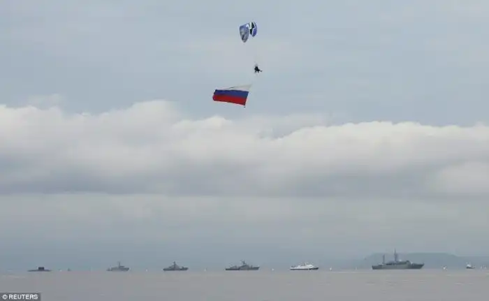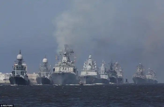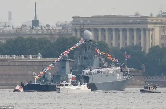 Тем временем в Санкт-Петербурге президент России Владимир Путин принимал масштабный военно-морской парад. Свыше 50 военных судов и подводных лодок прошли вниз по Неве и вышли в Финский залив.