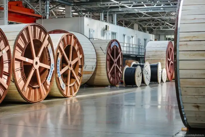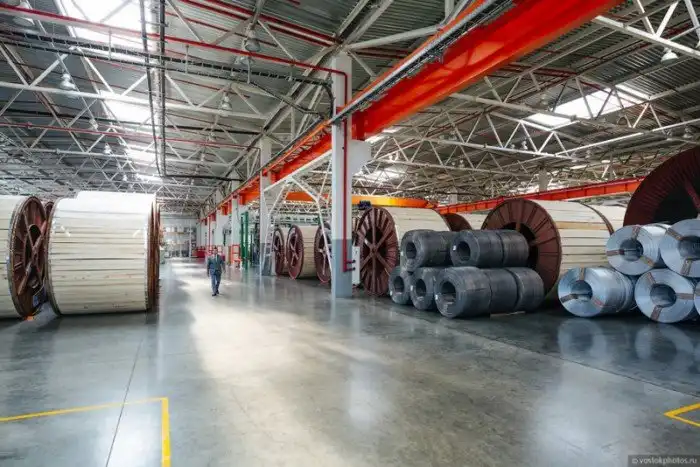 «Сердце» силового кабеля — это токопроводящая жила. Так выглядит производственный цех и склад, на котором барабаны с готовой продукцией ждут отправления к заказчикам, а алюминиевая катанка ждет производственного часа.