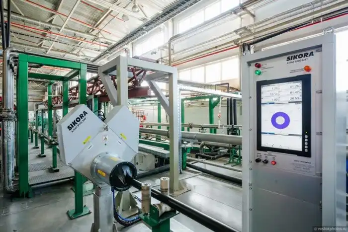 На всех этапах производства трубы проходят тщательный контроль. На фотографии — мастер цеха прямой трубы Иванов Валерий Вячеславович, который с помощью дефектоскопа проверяет толщину полиэтиленовой оболочки.