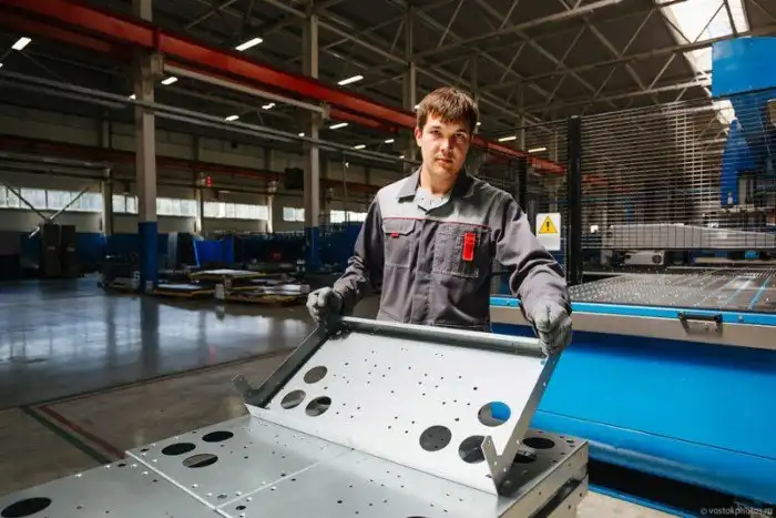 Вот что получается из обычного листа железа, после прохождения первого этапа обработки в цехе металлоизделий. С применением пробивных станков, которые работают по заданной программе, из листа получается уголок для ячейки комплектного распределительного устройства. Пока изделие не готово для применения — необходимо зачистить острые углы и согнуть, согласно чертежам. После всех необходимых манипуляций уголок станет частью ячейки и сможет выдержать вес свыше одной тонны.