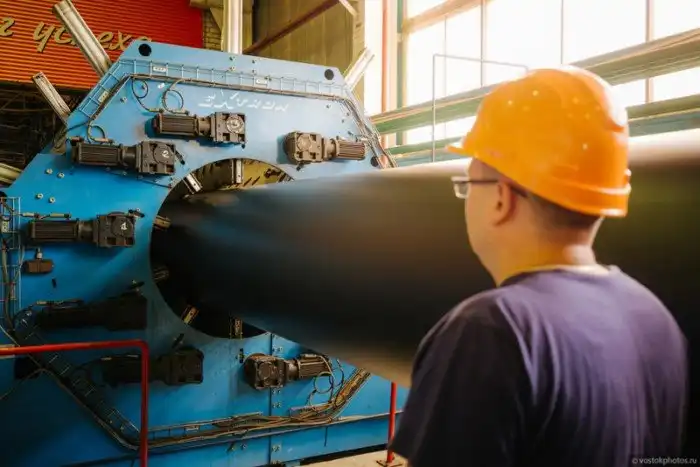 Во время производства полиэтиленовой оболочки, труба непрерывно выходит из экструдера. Данный процесс сложно остановить, поэтому трубу постоянно режут на куски размером от 8 до 12 метров, в соответствии с требованиями заказчика.