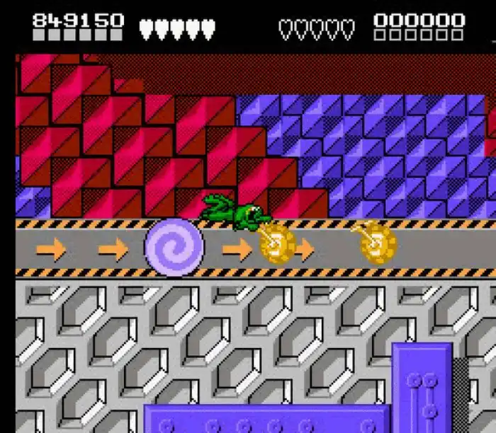 «Боевые жабы» стоят несколько особняком: они сами, без помощи китайцев собрали столь внушительную коллекцию глюков, что явно претендуют на пьедестал в номинации «самая забагованная NES-игра». И при том, что игрушка сама по себе, прямо скажем, чертовски сложна, она припасла за пазухой еще пару неприятностей. Главная из которых поджидает рискнувших пройти Battletoads вдвоем (а это одна из немногих игр, которые вдвоем проходить сложнее), причем почти в конце, в 11-м уровне. Клингер-вингер, безумные гонки на одноколесном драндулете от дьявольского психоделического кругляша. Только вот у жабы, садящейся на второй самокат, почему-то сразу случается паралич конечностей (не иначе от страха), и она перестает реагировать на команды геймпада. Итог – неминуемая смерть второго игрока. Впрочем, какой-никакой выход есть – можно пройти уровень одному и, слив continue, в следующем уровне возродиться уже вдвоем [а еще можно купить европейскую версию, где этот баг исправили, но это уже другая история].