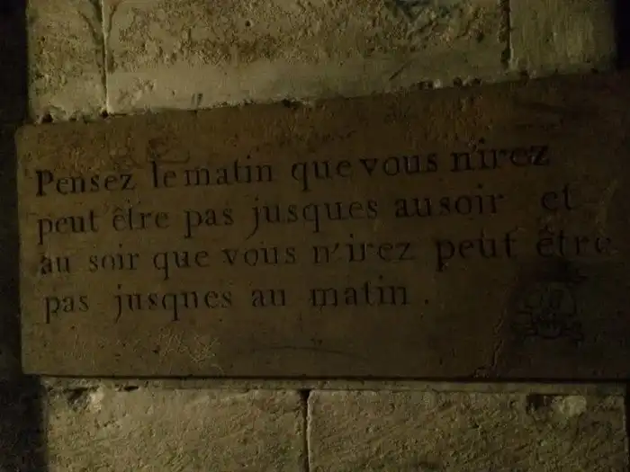 В катакомбах, как мы уже упомянули выше, есть не только кости, но и разные таблички. На этой, например, сказано, что хранящиеся тут останки привезены с кладбища Сент-Этьен в мае 1787 года.