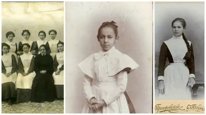 Юные барышни-гимназистки имели 3 комплекта одежды. В обычные школьные дни это было скромное платье коричневого цвета и небольшой черный фартук. Парадная форма состояла из того же форменного платья и белого нарядного фартучка. К платью пришивался кружевной воротник. В таком виде гимназистка ходила и церковь, в театр. Устав гимназии приписывал соблюдать чистоту, быть опрятной. В свободные дни девочка могла также надевать "свободное платье" любого фасона, если родители гимназистки могли позволить купить его для дочери. Цвет платьев менялся в зависимости от возраста девочки: младшие гимназистки носили форменную одежду синего цвета, 12-летние подростки до выпускных классов ходили в сине-зеленой одежде, а выпускницы - в темно-коричневых платьях.