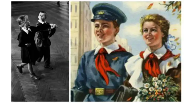 Введение школьной формы стало возможным после войны. В 1948 году был издан указ, по которому все школьники были обязаны носить форменную одежду. Она отчаянно копировала прежнюю обязательный наряд гимназистов. Похожая гимнастерка, длинные брюки и фуражка на мальчиках, платье с фартучком - на девочках. Вся форменная одежда приобреталась родителями за свой счет.