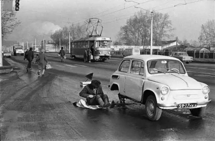 Ремонт автомобиля ЗАЗ–965 на проезжей части. 13 октября 1981 года.