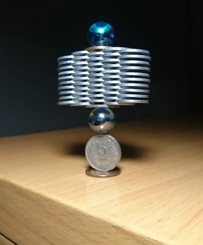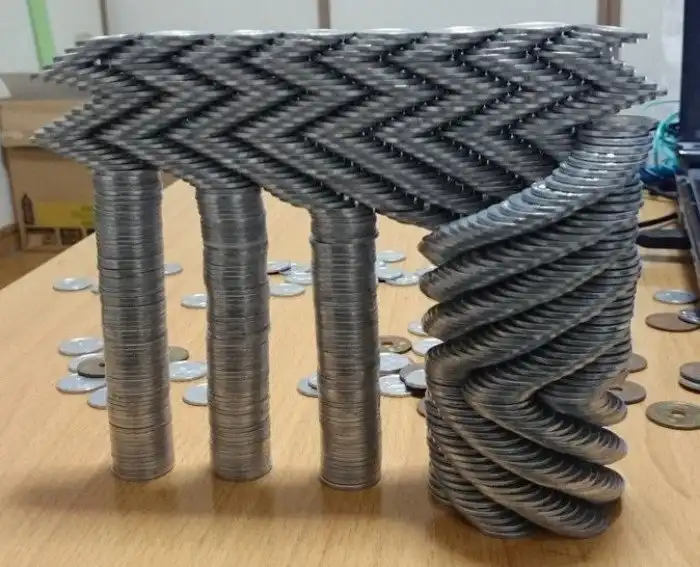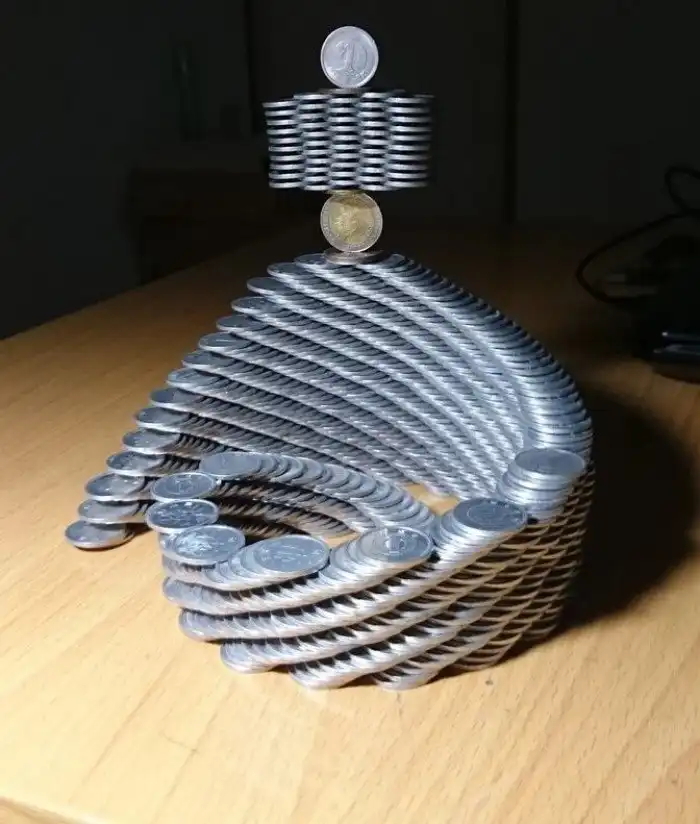 Выложить монетки башенкой, не используя никакого крепежа, дело нехитрое. Просто долгое — один просчет, неверное движение и все обрушилось. Но Тану известен тем, что мастерски играет с дизайном или, правильнее сказать, архитектурой своих изделий. Ладно бы это было напечатано на 3D-принтере, можно поверить в век высоких технологий. Но сложено вручную?