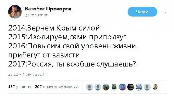 всегда вырубало это явление - кто такой актер в политике? это, как таксист Ашот на месте председателя администрации области - что он понимает в у правлении? правильно - ни-че-го!!! но, сука, судить всех на право и налево - это святое! и вот, пока одни *бланы поднимают в стакане бурю, по поводу того, о чем и понятия не имеют, путая негатив от крошек в своей постели с негативом от срыва сроков ремонта теплоцентрали, другие, не шибко далекие люди, за этим шоу наблюдают и чего-то там обсуждают с умным видом и прогнозами, словно в этом есть какая-то логика и смысл.... смысл в этом непременно есть, и хозяева-карабасы эти лицедеев и прочих перепуганных псевдо-интеллигентиков имеют на всю катушку не только это своё театральное стадо пафосных алкоголиков, но и их туповатых зрителей!