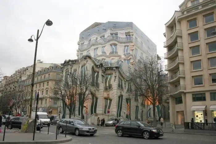 Несколько лет назад на парижской Авеню Георга V можно было увидеть необычный "тающий" дом. Издалека он выглядел причудливой фантазией архитектора. Конечно, все было гораздо проще. Здание реставрировали, а строительные леса было решено спрятать за панелями, на которых в искаженном виде, по задумке модного дизайнера Джона Пью, были приклеены изображения здания. Для пущей правдоподобности позвали известного скульптора Фредерика Беаудона, который прикрепил поверх изображений пенопластовые карнизы и другие элементы декора. Поэтому здание выглядело правдоподобным, хоть и очень необычным.