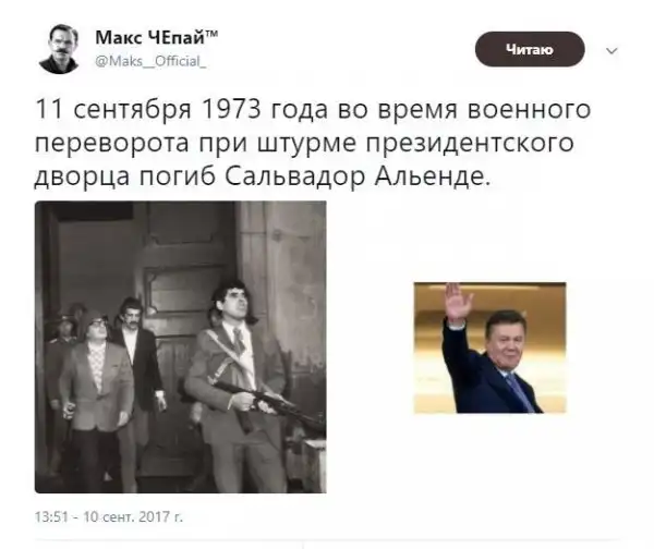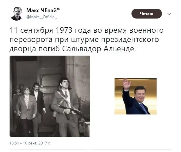 Смотрел Фурсова где он рассказывал про Альенде и Пиночета, оба были друзья-товарищи в одном тайном обществе. По этой причине Альенде не верил информации о захвате власти Пиночетом. Дружба дружбой, а переворот по расписанию. Еще один пример когда во власти нет никаких друзей и монополии , а только интересы Игроков и политические Пешки для достижения результата.