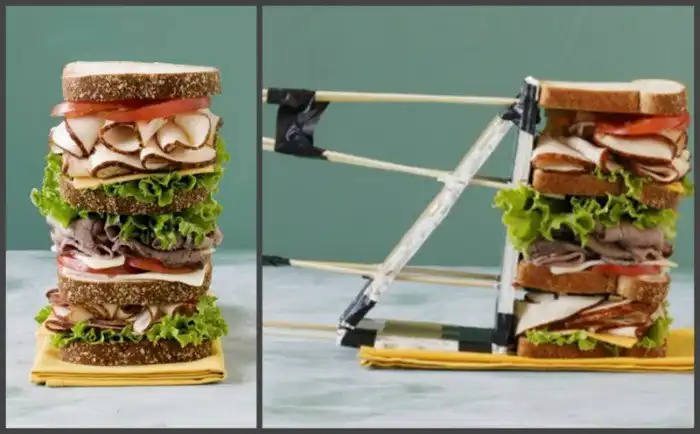 Им нужна опора. Позади этих аппетитных бутербродов скрывается произведение инженерного искусства, которое поддерживает структуру. Вся конструкция зафиксирована клейкой лентой, зубочистками и картоном.