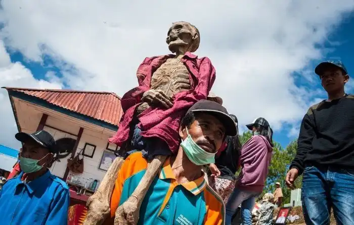 В праздничные дни селения народности тораджан в Индонезии напоминают обитель оживших мертвецов. В праздник урожая здесь выкапывают из могил умерших родственников, причесывают и наряжают их, а затем сажают за праздничные столы и прогуливают по улицам.