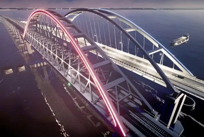 Уже завершена сборка автодорожной арки Крымского моста: ее свод замкнут на высоте 45 м от основания конструкции. Одновременно мостостроители подготовили к установке на фарватерные опоры железнодорожную арку.