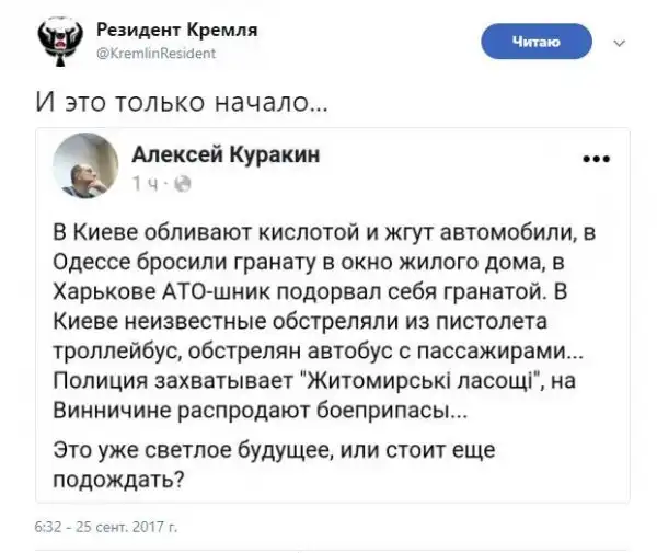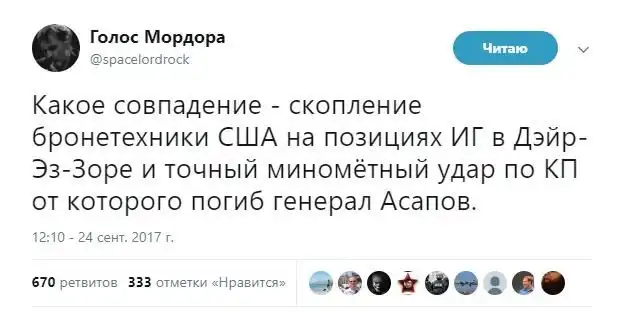 Как происходят такие вещи? Сбитый Су-24. Подлый обстрел крылатыми ракетами аэродрома, на котором находились наши специалисты. Теперь убит генерал (еще раз повторю, генерал) российской армии. Не пора бы прекратить это терпеть? Как будто первокласнику надавали подзатыльников. Кроме странной и непродолжительной экономической блокады Турции и пустых предупреждений со стороны МИДа, никакой реакции. Может, военные возможности страны не такие, как при СССР, но для собственного самоуважения стоит раз уничтожить американский или турецкий контингент на территории Сирии. А потом сказать: "С кем не бывает, теперь и мы "нечаяно" допустили ошибку при наведении".