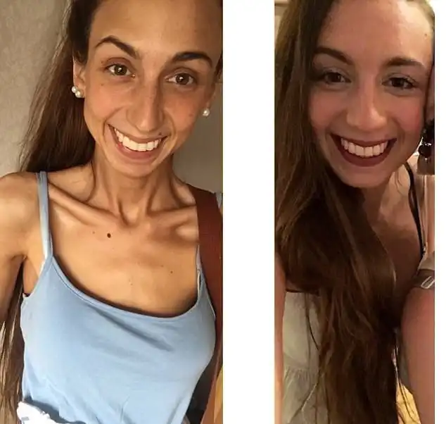 23-летняя немецкая студентка Валентина Хомберг (Valentina Homberg) из города Вупперталь настолько увлеклась идеей стройного тела, что у нее развилась анорексия. Регулярные занятия в тренажерном зале сильно выматывали девушку, при этом ее дневной рацион состоял всего из 150 калорий. Она отказывалась от еды и в результате похудела до 44 кг. После того как у Валентины начались проблемы со здоровьем она все же начала есть и результат не заставил себя долго ждать. Ей удалось набрать почти 20 кг и навсегда забыть об анорексии.