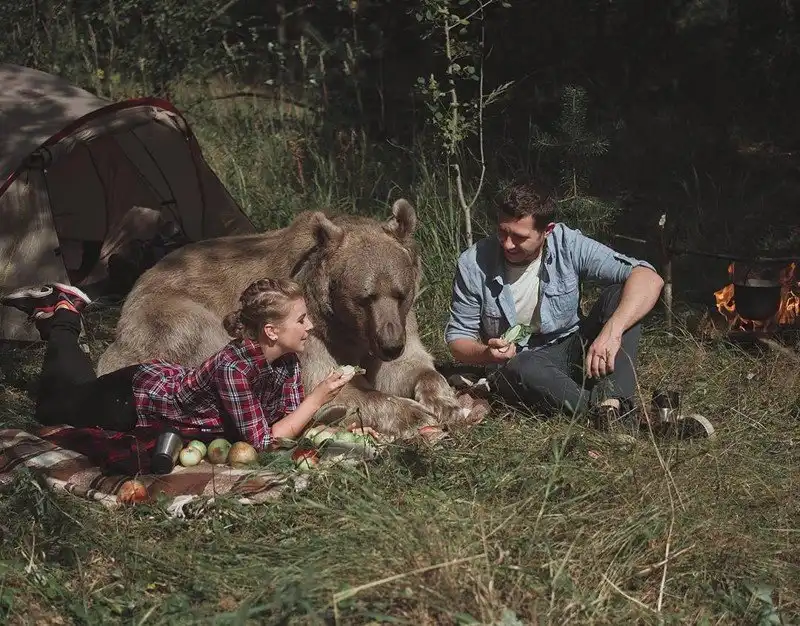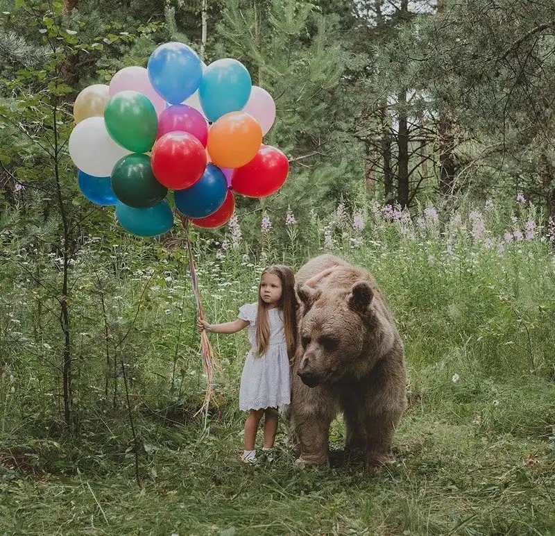 Частым героем фотосессий Ольги является медведь Степан, который вырос в неволе, так как еще совсем маленьким был брошен матерью, семейная пара подобрала малыша и стала заботиться о нем.