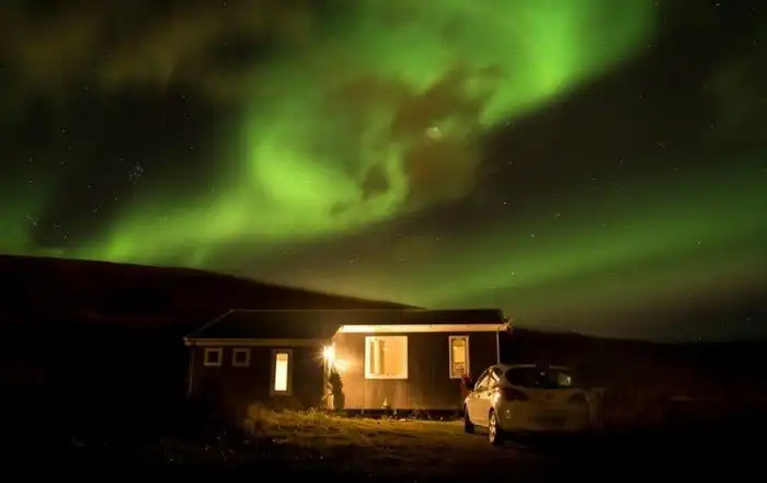 На севере Исландии вы можете снять настоящий щитовой домик в отдалении от цивилизации. Зато всю ночь вы будете видеть исключительно северное сияние - и ничего больше! Ближайший городок Акурейрин похож, скорее, на большую деревню. В кухне имеется лишь плитка без духового шкафа. Разместиться здесь смогут лишь два человека.