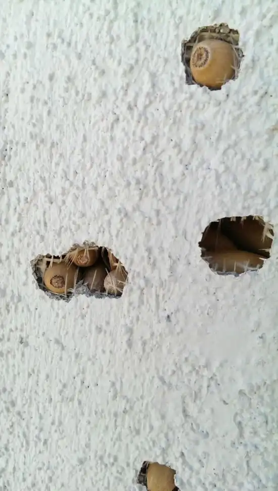 Вернувшись в свой дом, хозяин обнаружил, что синтетический сайдинг, которым были отделаны наружные стены, изрешечен большим количеством дыр. Еще больше мужчина удивился, когда заглянул внутрь этих дыр и обнаружил в них... желуди. Как оказалось, на его жилище совершили налет желудевые дятлы (муравьиные меланерпесы), которые решили обустроить здесь свой склад желудей.