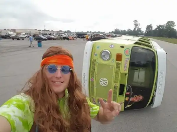 Ужасная авария? Нет! Этот автобус спокойно ездит на боку. Внутри спрятана легковушка