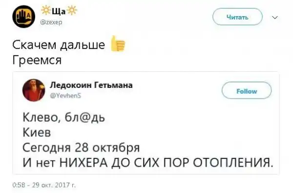 Не надо только включать дурака в расчете на дураков, ага? Это среди недоразвитых и в расчете на недоразвитых сегодня модно не к месту "остроумно" шутить про "путин виноват". Понятно, что никто не станет обвинять солнцеликого, если какой-нибудь алкаш клемники чтобы долго не откручивать решит малость нагреть)) но вопрос о том, что в стране почти все, что функционирует осталось от союза, начиная от систем канализации и заканчивая комбайнерами и не на что заменять - вина руководства страны. То, что какой-нибудь конкретный вася в деревне бухает - володя не особо виноват, а то, что начиная с 90х и заканчивая уже почти 20 лет спустя в стране целенаправленно уничтожается село, нет работы, заброшены пахотные земли, неподъемные кредиты для сх-производителей, вышла "реформа" по закрытию сельских медпунктов и фельдшерско-акушерских кабинетов, из бюджета систематически выделяют на сх около 1% и т.д. - это прямая "заслуга" путлера и только его. То, что где-то очередной хач изнасиловал или зарезал кого-то - вова тоже не сильно виноват, а в том, что большинство семей коренных жителей в России заводят лишь одного ребенка, от силы двух, т.к. не на что жить, реальные средние зп в стране 15-25 тыс. рублей, при том, что в стране на 2% мирового населения приходится чуть не треть всех мировых ресурсов, и это самое коренное население вымирает и замещается приезжим зверьем еще и под лозунгами толерантности - это прямое следствие проводимой за последние 30 лет политики, включая проводимую вовой с его абсолютной властью 17 лет. То, что сократили очередного конкретного Петю с завода или фермы - конечно, не по прямому распоряжению путлера, а то, что в стране сплошной импорт на 4/5, что практически нет промышленности, а экспортируются лишь оптом ресурсы, доходы от которых еще и разворовываются - непосредственное следствие функционирования путлеровского клана. То, что в какой-нибудь больничке остигматизм с остеохандрозом спутали - не прямая вовина вина, а вот, то, что ЗП у медиков такие, что там остаются от безысходности досиживать до пенсии бабушки полуслепые, да наиболее тупые выпускники мед. институтов, которых в частную клинику не взяли - непосредственная вина ублюдочной власти олигаршьего ставленника. То, что дети школы заканчивают с пустыми головами - аналогично, я хз кто, являясь хорошим специалистом, в здравом уме пойдет учителем в обычную школу на такой оклад. Уловил аналогию? Долго можно перечислять и про фактическую арефлексию судебной системы в стране, и про полное отсутствие ответственности у властьимущих, про повальное воровство, коррупцию, бюрократию я уже говорила.
