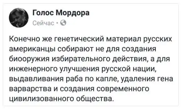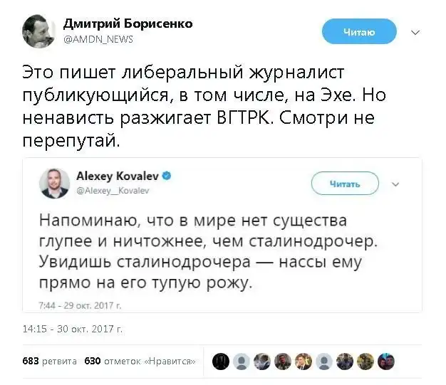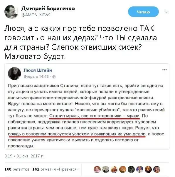 Это надо четко понимать и не важно, что они пишут- о деспоте Путине,Сталине или о том как было хорошо в пионерлагерях и бесплатных школах, больницах при том же Сталине. Все на чем только можно наковырять на вентилятор все идет в разработку для эмоционального развода с последующим тыканьем пальцем на того, кто в данный момент больше всего противостоит Западной Цивилизации Паразитов.