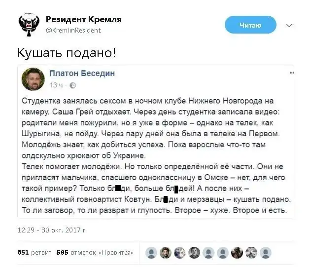 Молодец крылатые слова двумя руками за- пора изкоринять бл*дство и бл*дей и телевезионные каналы