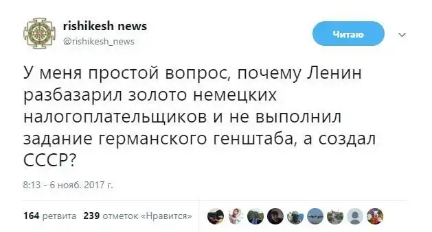 От же пропагондоны, Ленин, бл*дь неподкупный. Благодаря его деятельности развалилась российская армия, мы потеряли западные территории: Финляндия, Польша, Прибалтика, Западная Белоруссия, немцы в Дону лошадей по или, ну и вишенка на торте - красный террор, истребивший цвет нации. В общем, немецкие инвестиции окупились с милионнопроцентной рентабельностью. Товарищ Ленин в идеале сделал то, о чём вы постоянно верещите на всех углах про продажных либералов, работающих за гослеповские печеньки, только он, в отличие от ваших фобий, всё реализовал за кайзеровские печенюшки.