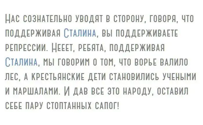 "Меня действительно восхищает система, которая была создана в Союзе за кратчайшее время. Почитайте художественную литературу: В«Два капитанаВ», В«Республика ШКИДВ» - как интересно была устроена жизнь, как вытягивали людей на более высокую ступень. Ты можешь быть лучше, чем ты есть сейчас! И это дало такой мощнейший эффект, что буквально через 20 лет после окончания Гражданской войны мы встретили цивилизованный Запад, пришедший к нам с очередным крестовым походом, во всеоружии.