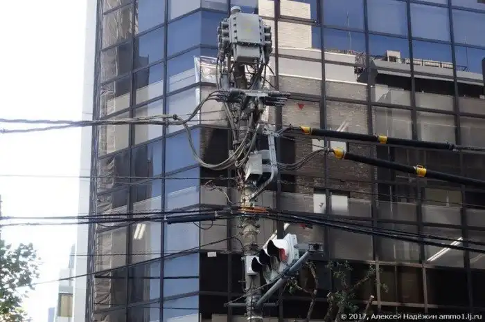 Удивительно, но в супертехнологичной Японии часто можно встретить трансформаторы, висящие на столбах. Маленькая тихая улица. А что-это там виднеется слева?