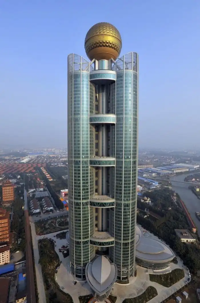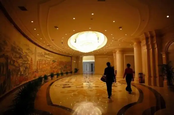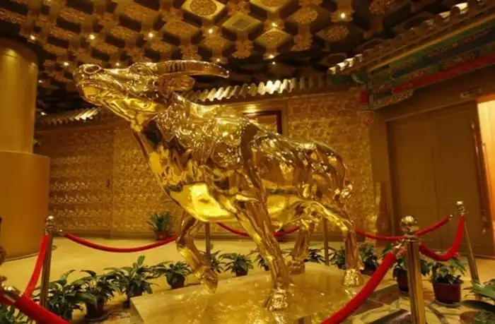 Внутреннее убранство отеля - это много золота, красного и роскошь в том понимании, как ее видят китайцы. В холле 60-го этажа стоит статуя золотого быка. Он на самом деле выполнен из чистого золота. Сначала быка планировали водрузить на верх небоскреба, но в этом случае здание стало бы самым высоким в Китае, даже выше знаменитого небоскреба в Пекине, чего деревня себе позволит не может. Поэтому статуя осталась внутри отеля.