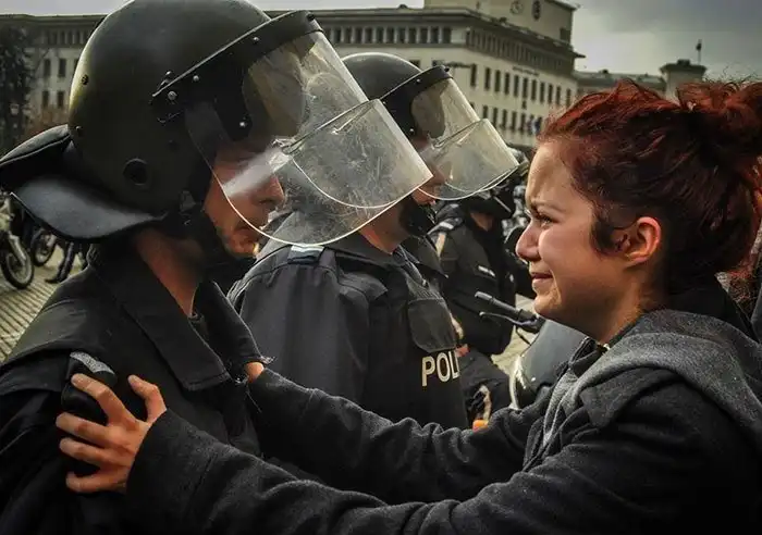 Девушка умоляет полицейских не применять силу против протестующих. Болгария, 2013