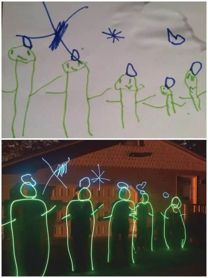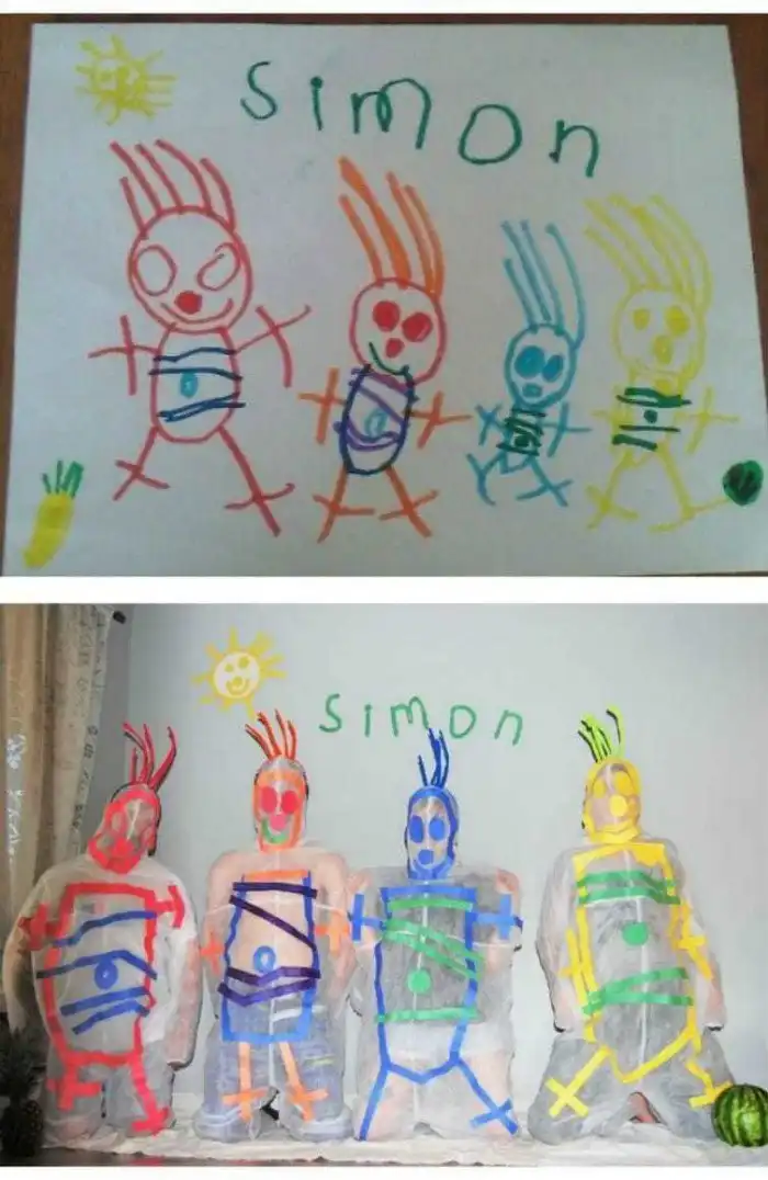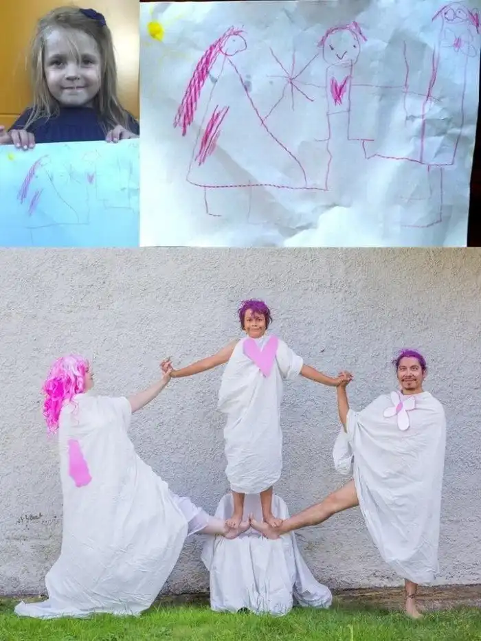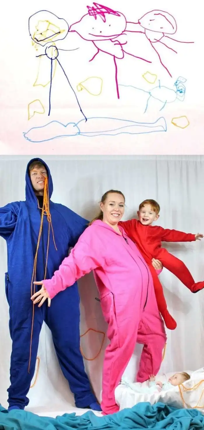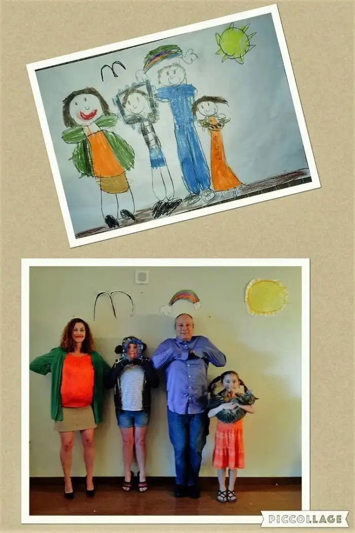 Моя семья: родители, забавно воссоздавшие рисунки своих детей
