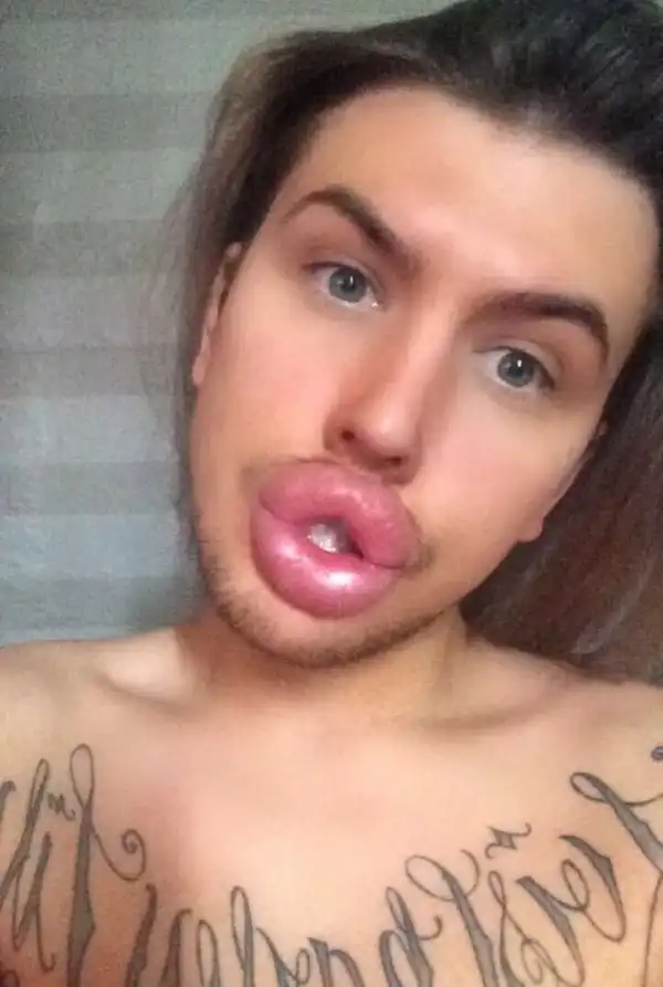 22-летний Джеймс Холт (James Holt) из города Манчестер немного сдвинут на теме красоты и очень хочет быть похожим на Ким Кардашян. До конца он не понимает, как это сделать, поэтому пока ограничивается инъекциями в губы, из-за чего его рот похож на красную задницу бабуина. На данный момент инвестиции в губы парня составили уже более £10,000. А колоться в лицо он начал с 17 лет, успел поставить филлеры в щеки, подбородок, скулы.