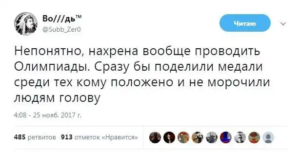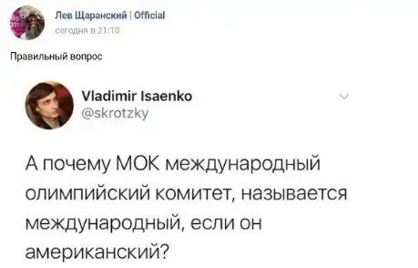 Молодец! Мужик! Сразу понятно, что хоккеист! Надо по всем дисциплинам такую фишку сделать! Не хотите видеть Россию на олимпиаде, боитесь. Так приезжайте на нашу!