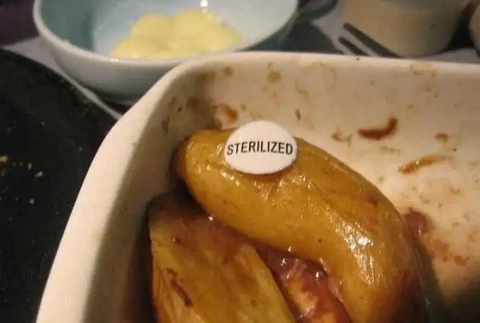Приятно, что авиакомпания заботится о безопасности пассажирских желудков, но надпись "Стерилизовано", наклеенная прямо на сосиску, наводит на неприятные раздумья.