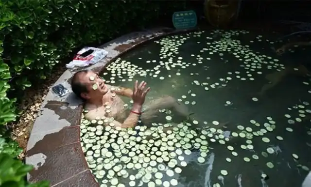 В Китае особой популярностью стал пользоваться новый вид отдыха, который предлагают многочисленные СПА-салоны страны. Клиенты могут принимать горячие ванны с самым необычным наполнением. Главный принцип такого отдыха заключается в том, чтобы посетители могли есть и пить то, в чем они купаются. Ванны наполняют кусочками яблок и арбузов, цитрусами, огурцами, корнями имбиря и даже древесными грибами. Предлагают и такие наполнители, как молоко, вино и другие.