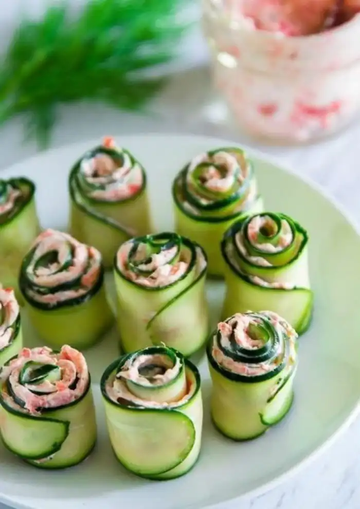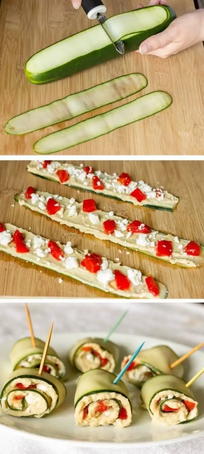 Для этого блюда понадобится большой огурец, паштет или любой соус с кусочками овощей и зубочистка.
