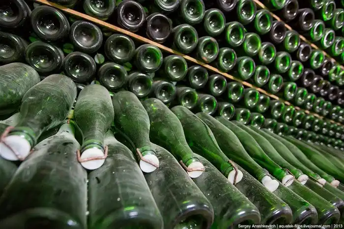 В тоннелях бутылки укладываются к горизонтальном положении в штабелях. Как я уже сказал выше, здесь в них происходит процесс вторичного брожения. В них под воздействием дрожжей и тиражного ликера образуется углекислота. Сам процесс длится примерно 30-40 дней, после чего дрожжевая культура умирает и расщепляется на различные соединения. Так создается, а вернее, формируется аромат будущего шампанского.
