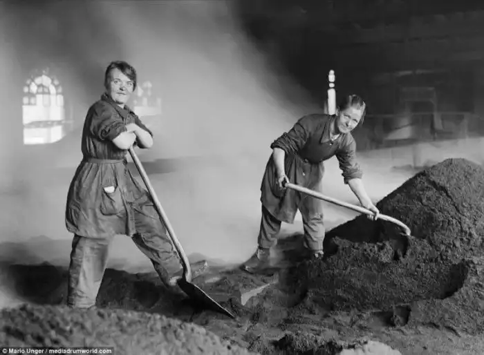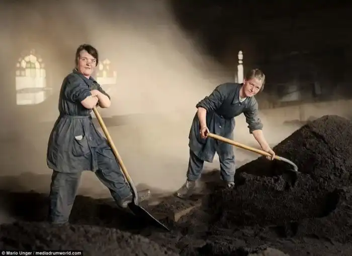 На снимке: женщины, сгребающие уголь на сахарном заводе Glebe Sugar Refinery в Шотландии. Во время войны, когда большинство трудоспособных мужчин сражались в окопах, женщинам пришлось занять их место на заводах и фабриках. К концу войны к работе в промышленности было привлечено примерно 80 000 женщин. Считается, что с этого момента началось "пробуждение" среди женщин Великобритании и вообще в Западной Европе. Те, кто работал во время войны, после нее не хотели опять заниматься исключительно домашним хозяйством.