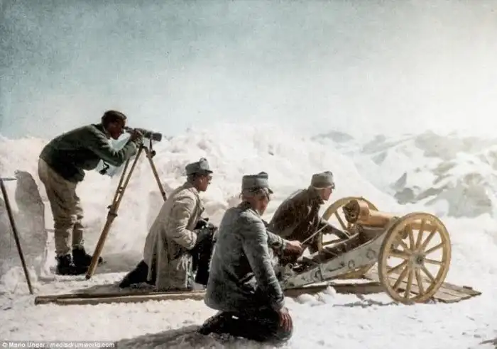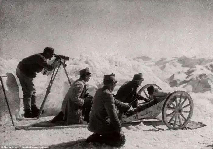 На снимке: австрийский горный пулемет M99 7 см, установленный на горе Ортлер - самой высокой точке Восточных Альп. Фотография сделана в 1917 году на высоте 12 812 футов. В тех местах сражались австро-венгры и итальянцы, и их конфликт увековечен в романе Эрнеста Хэмингуэя "Прощай, оружие".