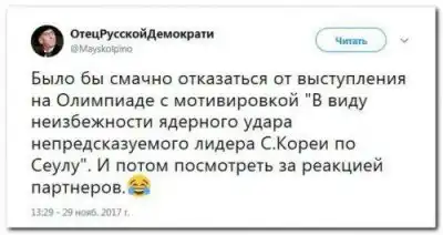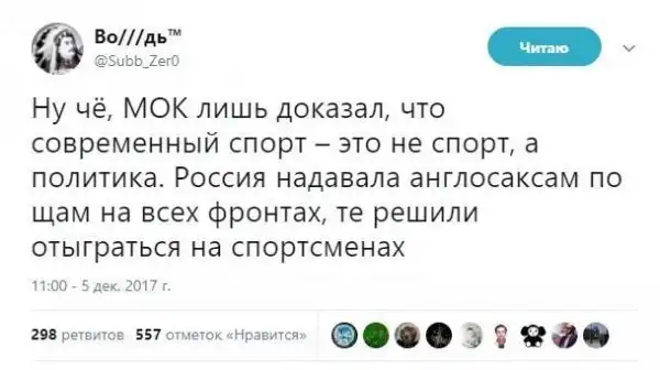 Прикол в том, что ты ворвался весь такой рыцарь в белом "вы все вокруг п*дарасы и даже них*я никогда не поймете душу спортсмена и тд и тп", а когда тебе тонко намекнули, что не ты один за спортсменов переживаешь и есть ситуации пострашнее бойкота олимпиады сразу сдулся и обиделся ) Вся суть нашего протестного движения современного