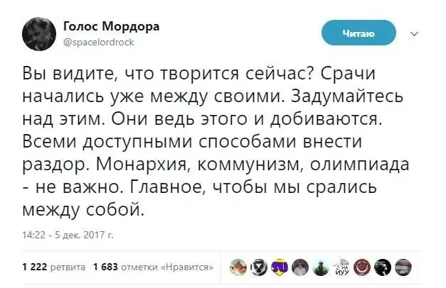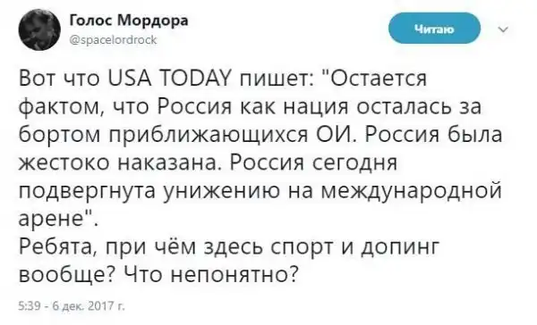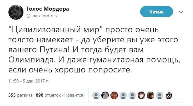 Вопрос для тех, кто так легко заводится и яро поддерживает подобного рода твиты как в посте: вы когда-нибудь задумывались над тем, что эти, с позволения сказать объективные люди (мое мнение это боты на зарплате) представляют Россию и ситуацию за ее пределами ИСКЛЮЧИТЕЛЬНО с одной стороны? Вам никогда не приходило в голову что это крайне странно? Ведь никто из подобных