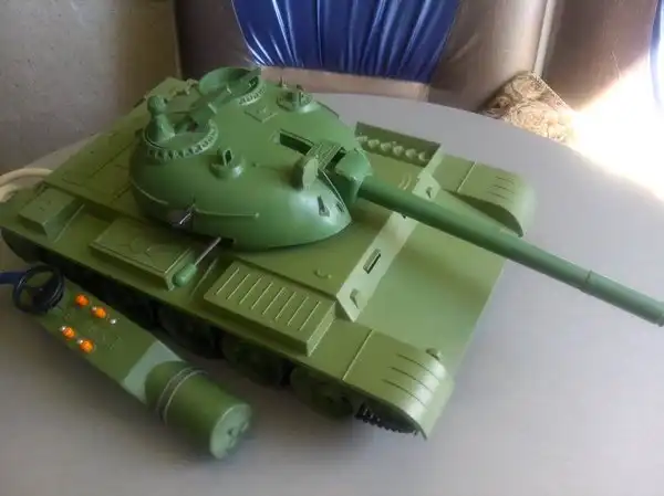 Сбоку рычажок с зелёной пипкой, его тягаешь и заряжаешь. а металлической пипкой - ОГОНЬ! пыщ бабах. Я на нём с отломанной башней даже катался...