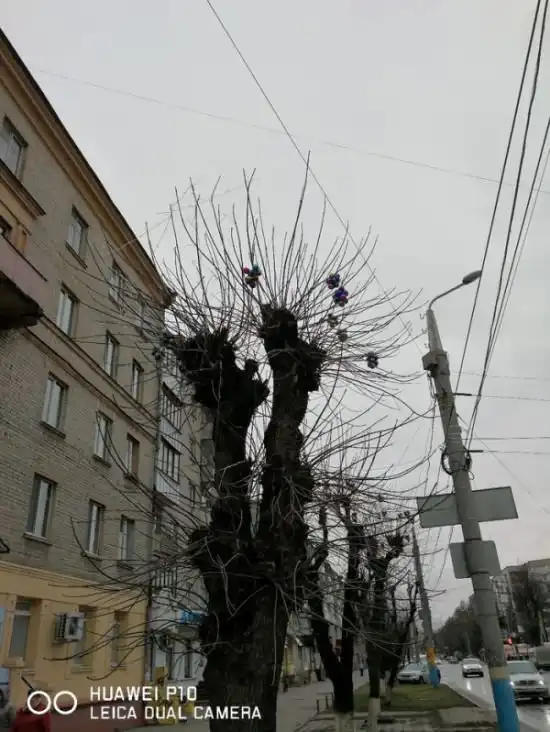 Новогоднее украшения Бежицкого района Брянска поразило жителей города. Здесь на ветки сухих деревьев повесили шары, а ограды украсили кольями, привязанными красными ленточками. Судя по всему, на другие предметы декора денег из выделенного на украшение районов 1 миллиона рублей больше не хватило.