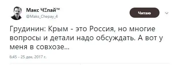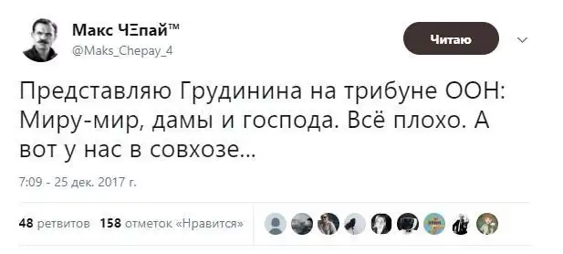 И кроме обычного популизма и экстраполирования своего совхоза на всю планету этот начинающий маразматик ещё ничего не выдал.