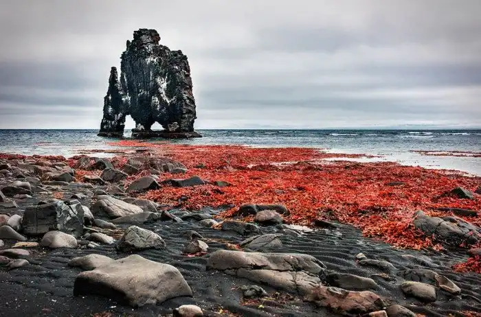 Спящий тролль — базальтовая скала Хвитсеркюр на северо-западе Исландии. Красные водоросли, большие камни, драматическое небо. © Liz Glasco