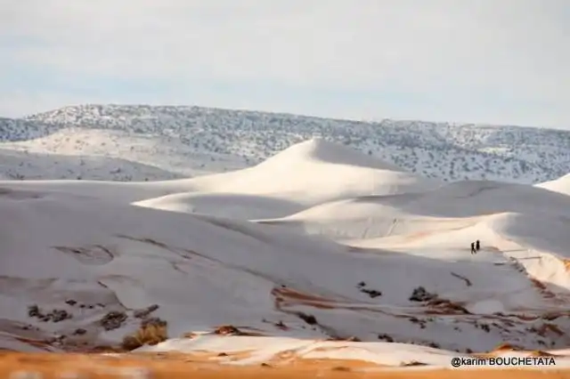 В Алжире на севере пустыни Сахара близ города Айн-Сефра второй год подряд выпал снег. Около 40 сантиметров осадков выпали утром 7 января. Снег достаточно быстро покрыл песчаные дюны, в результате чего удалось сделать зрелищные фото. К вечеру того же дня снег почти полностью растаял. Снегопад в данном регионе является достаточно редким природным явлением, за последние 40 лет снег выпадал здесь лишь считанные разы.