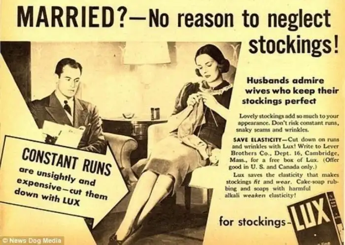 "Замужем? Это не причина небрежно относиться к своим чулкам! Мужья восхищаются женами, у которых чулки всегда в идеальном состоянии". Реклама мыла Lux для "сохранения эластичности" чулок